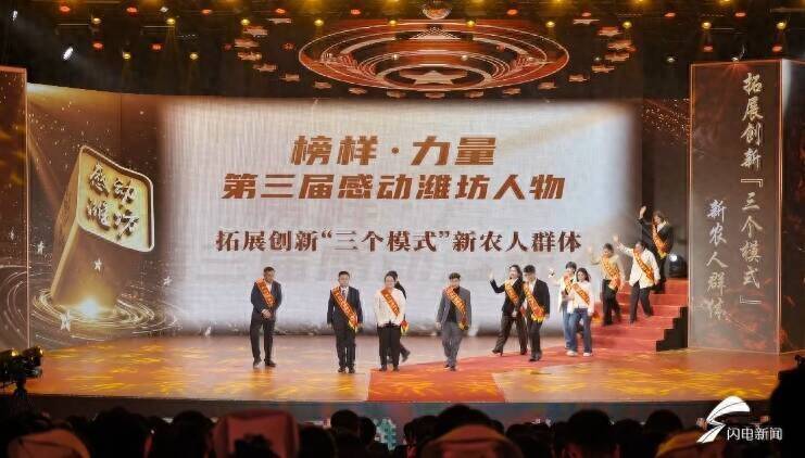 第三届感动潍坊人物颁奖现场,拓展创新 “三个模式” 新农人群体上台领奖。 (图片来源:闪电新闻)