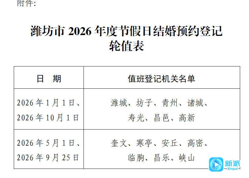 新派讯 12月30日,记者从潍坊市民政局获悉,为满足群众多样化、个性化婚姻登记需求,不断提升便民服务质效。2026年,潍坊市继续在元旦、劳动节、中秋节(农历八月十五)、国庆节当天,开展结婚预约登记服务。