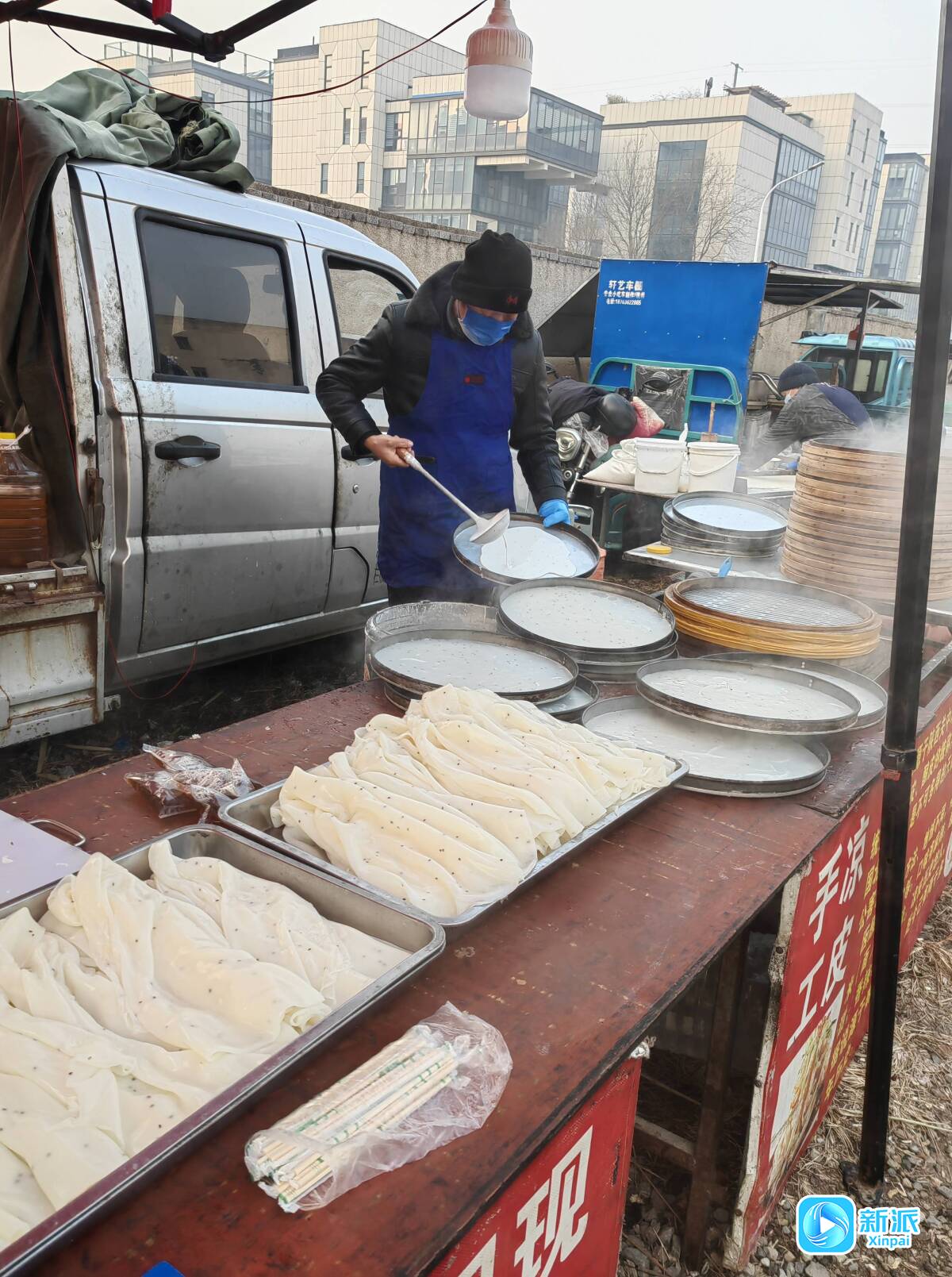 谁说冬天不能卖凉皮?大集上,“纯手工制作凉皮麻香溢口”的招牌格外显眼,摊主现做现卖。只见男摊主利落地擦盘、摊浆,将托盘推进蒸锅,热气升腾间凉皮很快成型。刚蒸好的凉皮散发着淡淡面香,等冷却后,女摊主铺上新鲜的配菜,淋上秘制酱汁,拌匀后每一根凉皮都裹满酱汁,吃上一口绵软爽滑、酸辣可口,让人味蕾大开。