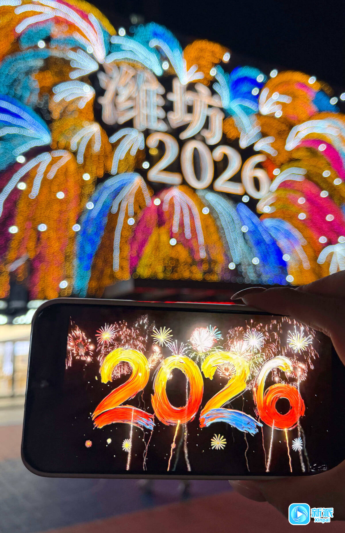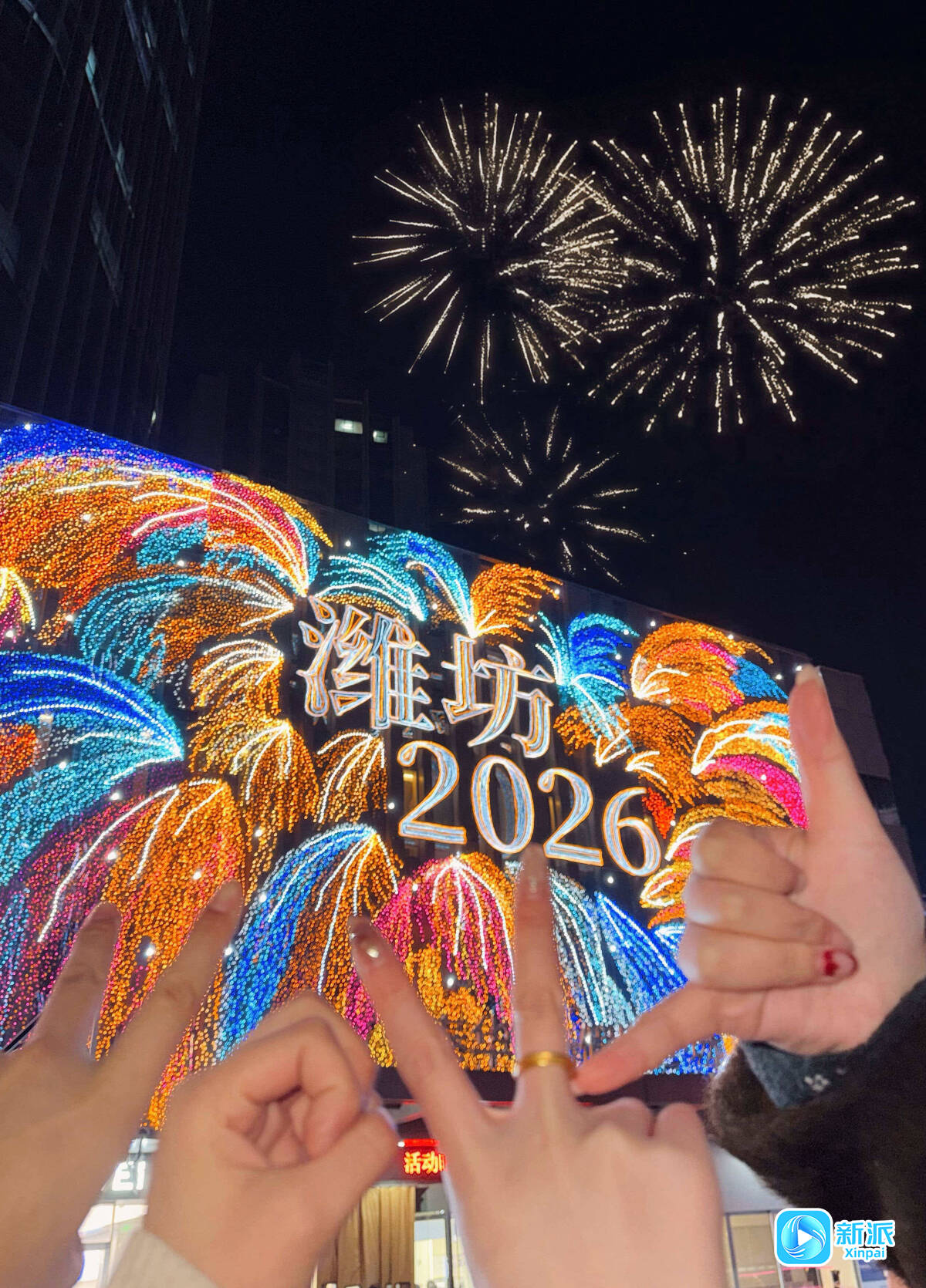 奎文区泰华商圈,“潍坊2026”字样大型户外装饰吸引市民拍照。