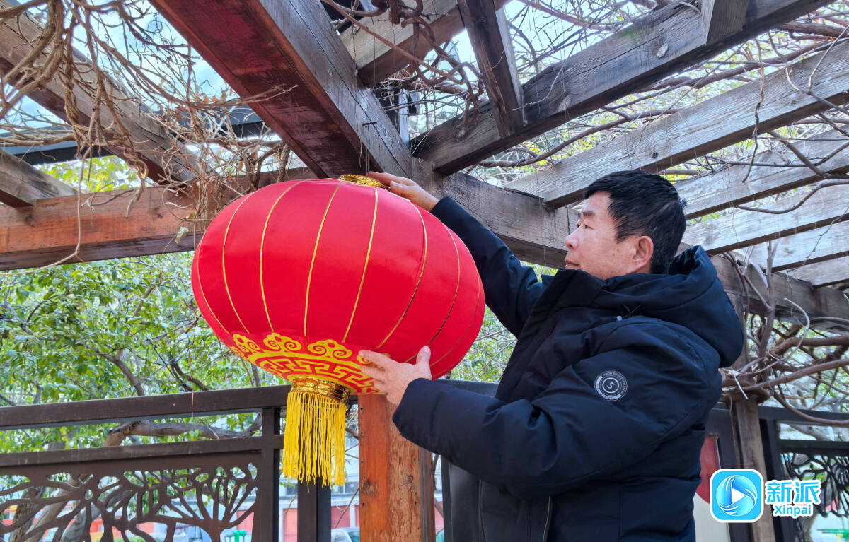 潍城区城关街道曹家巷社区工作人员悬挂大红灯笼。