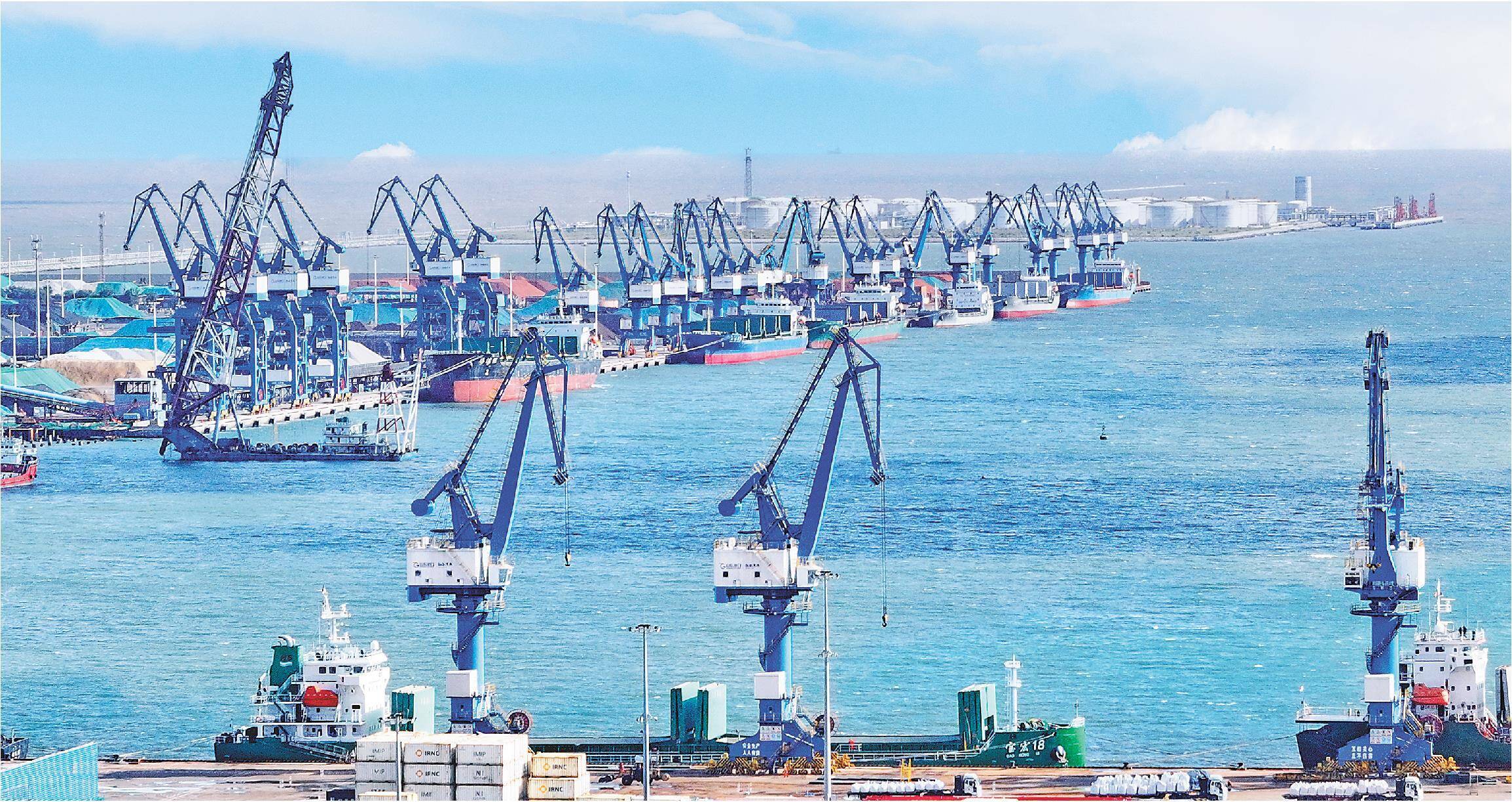 潍坊港码头岸桥林立,航运作业正酣。