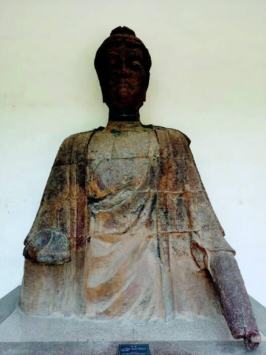 铁佛通体铁铸,残高2.78米、宽1.9米、重量约5吨。佛像为坐姿,肉髻高耸,面部丰腴,双目微垂,神情庄严,内着僧祗支,外穿双领下垂式佛衣,双臂及下半身已残缺。从造像风格判断,为唐代造像无疑。铁佛的铸造工艺采用分段模铸法,体现了当时高超的金属冶炼与铸造技艺,对于研究唐代潍坊地区的宗教信仰、冶铸技术等都具有重要学术价值,被业内专家称为国内现存唐代铁铸佛像的典型代表。