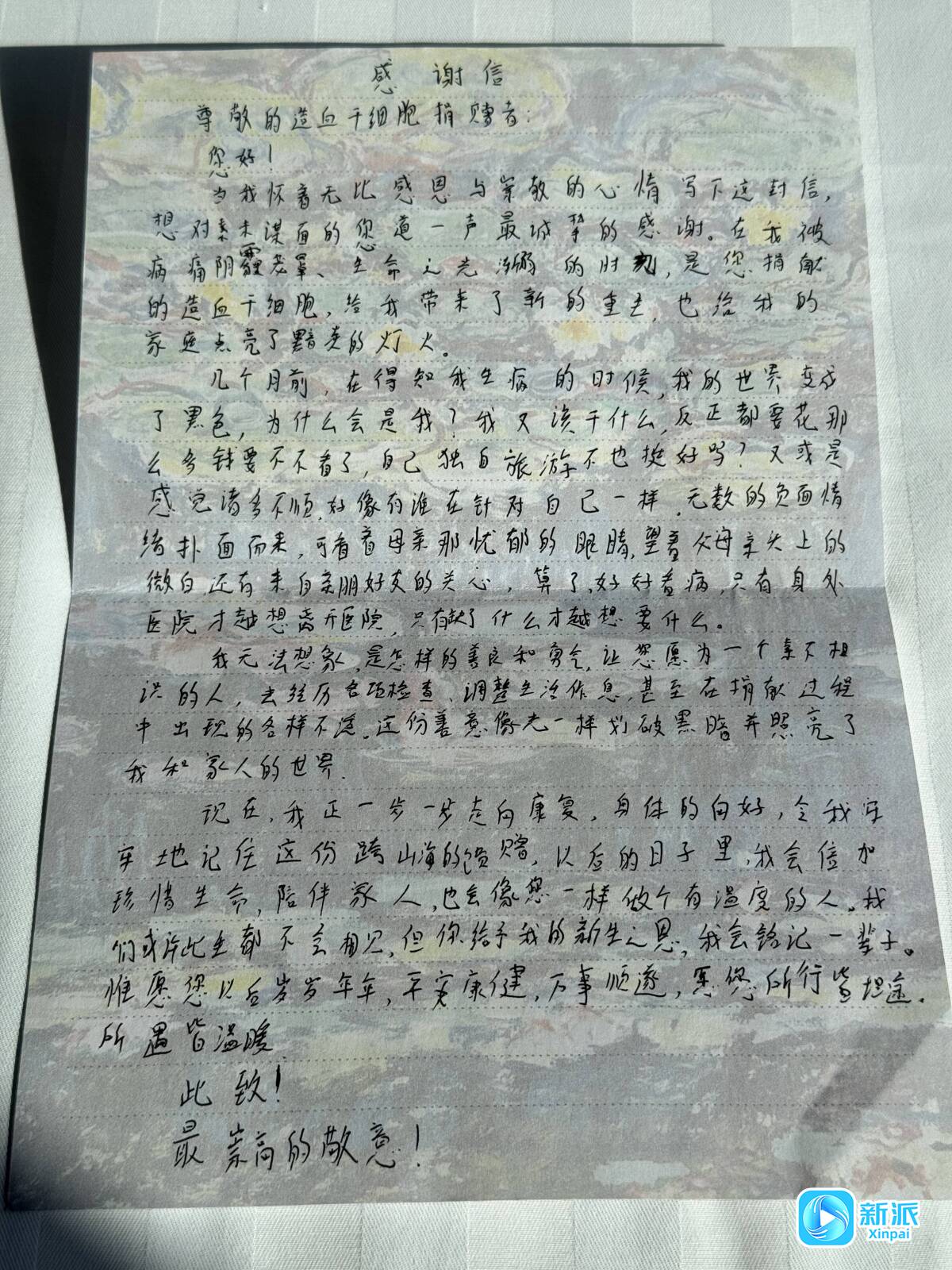 “我没有什么不适的感觉,捐献造血干细胞是我人生道路上的一次特别经历。”于承功激动地说,他捐献结束后,还收到患者的一封感谢信。信中写道“对素未谋面的您道一声最诚挚的感谢,我无法想象是怎样的善良和勇气让您愿为一个素不相识的人去经历各项检查、调整生活作息,甚至在捐献过程中出现的各样不适。这份善意像光一样划破黑暗,并照亮我和家人的世界……以后的日子里,我会倍加珍惜生命,陪伴家人,也会像您一样做个有温度的人……”