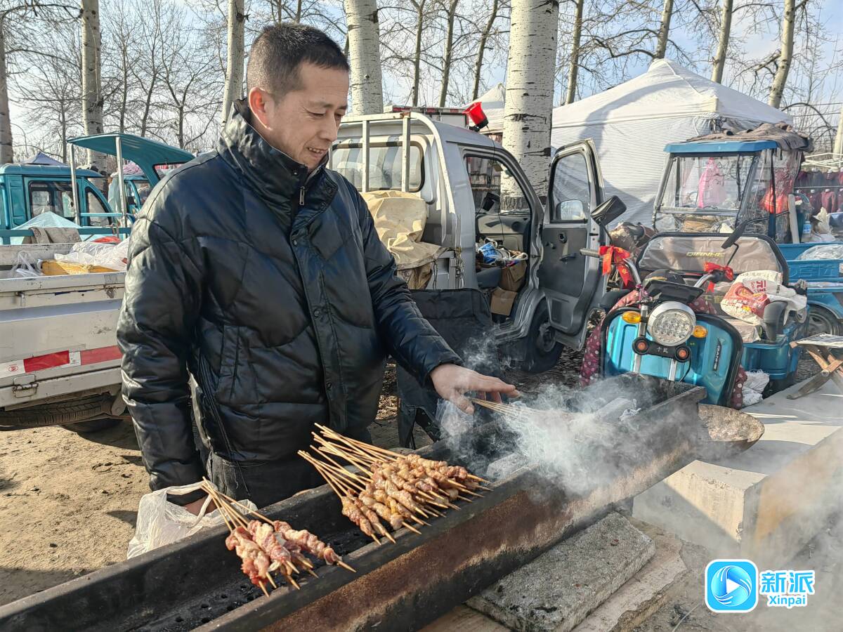 “香喷喷的烤肉串1元1串,特别好吃!”摊主的吆喝声和烤肉的香味,吸引了赶集人。烤串摊前烟火升腾、香气四溢,不少路过的人手中都多了一把热气腾腾的烤串,边吃边逛,幸福感爆棚。烤串摊旁是个卖肉摊,两位摊主是朋友也是搭档,一人卖肉,一人烤串,食材是让人看得见的新鲜。烧烤摊主在潍坊市区经营一家烧烤店,冬季是烧烤淡季,每逢寒亭大集他便来赶集烤串,没想到生意还不错。
