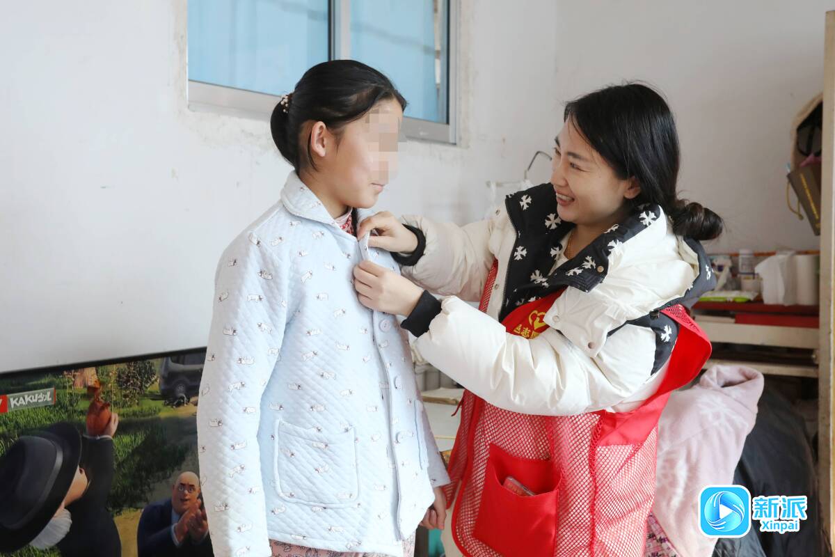 韩晓丹(右)帮困难学子试穿新衣服。