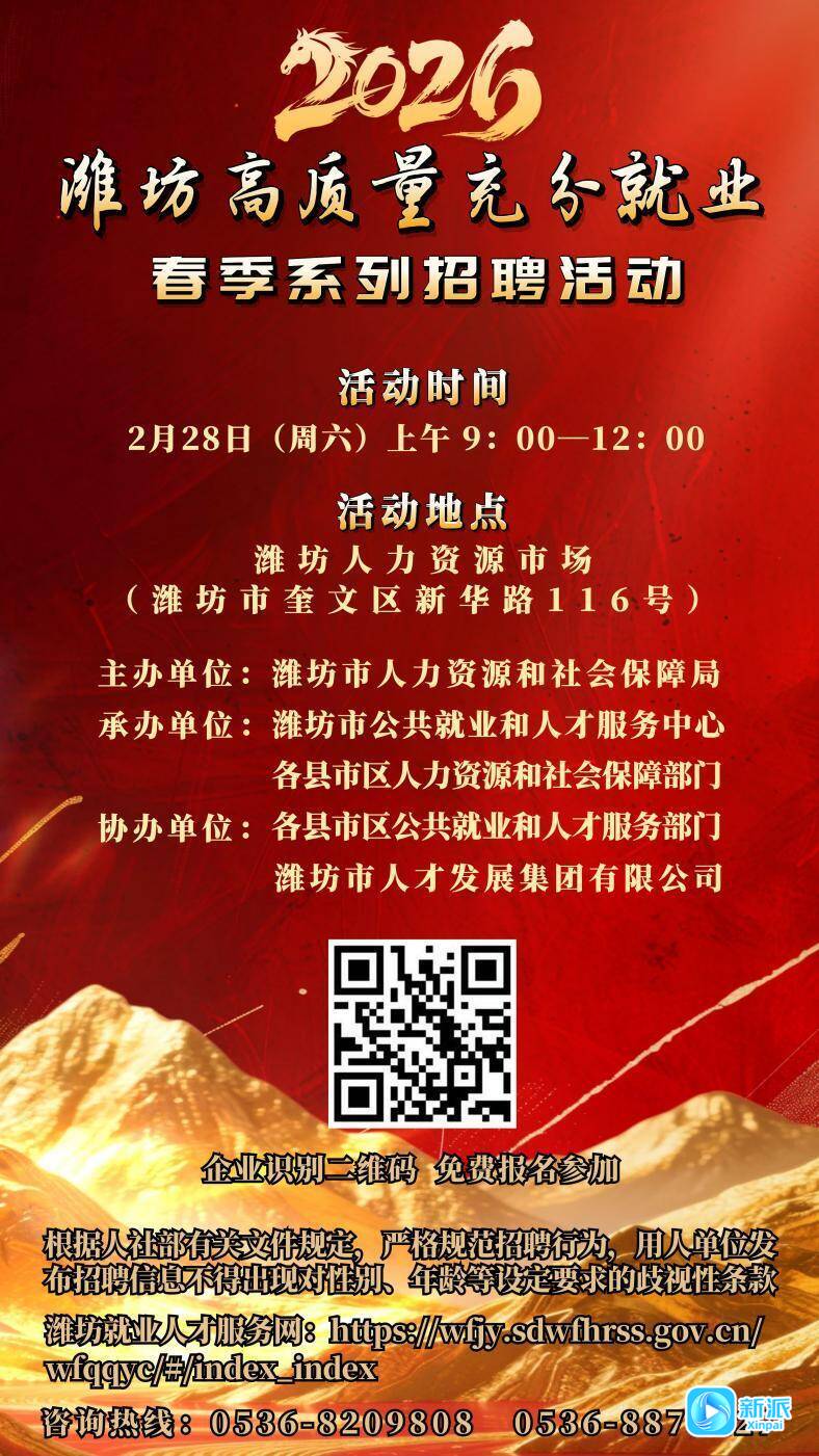 新派讯 1月16日,记者从潍坊市人社部门获悉,为搭建企业与求职者精准对接桥梁,助力企业实现"首季开门红",2026年潍坊高质量充分就业春季系列招聘活动将于2月28日(正月十二)上午在山东潍坊人力资源市场(奎文区新华路116号)正式启动。活动持续至4月底,通过"现场招聘+网络招聘+直播带岗"多维模式,为用工双方打造高效就业服务平台。