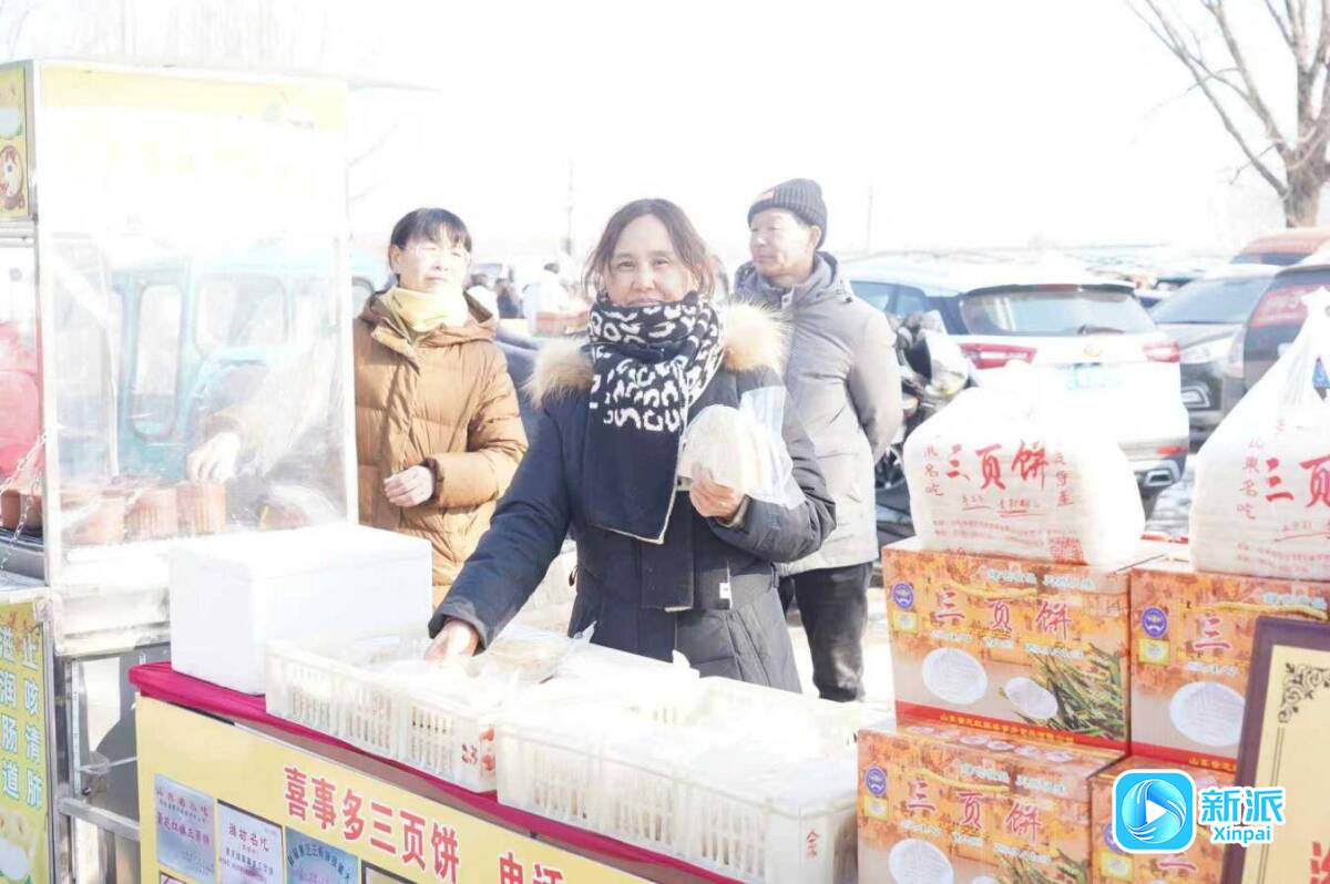 最具人气的当属景芝三页饼特色摊位——作为2025年“山东省地标美食”,景芝三页饼是大集上不可或缺的本土风味。“咱景芝三页饼本来就薄如纸、筋道十足,卷入景芝小炒和芝泮烧肉后,既有三页饼的焦柔口感,又满嘴肉香,实惠又解馋,老少爷们都爱买。”摊主赵大姐一边熟练地擀制饼皮,一边介绍。她告诉记者,自己是土生土长的景芝人,卖三页饼已有二十多年时间,今年依托海洋大集平台尝试创新,没想到大受欢迎,不少回头客提前预订年货礼盒。