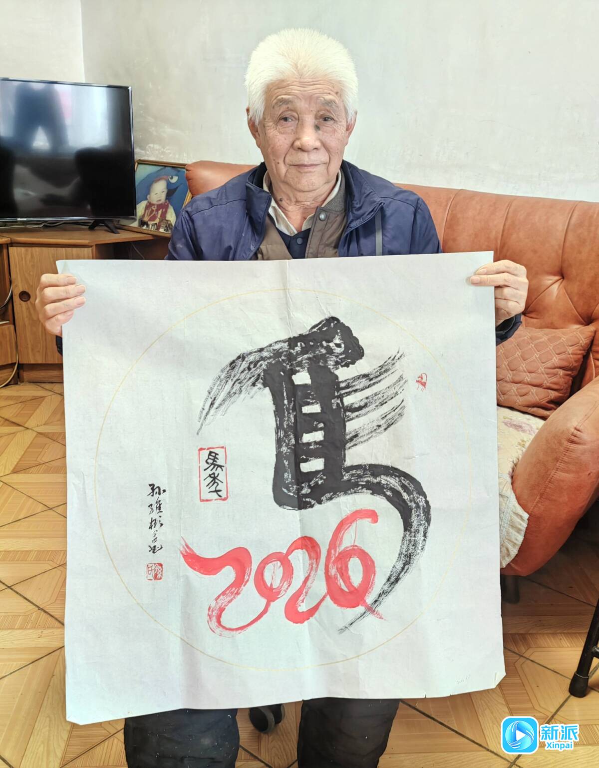 在作品《百马纳福》中,100个篆书“马”字结构各异,老人通过简洁的线条勾勒出马的形象,笔墨古朴苍劲,像是从宣纸奔腾而出的“神骏”,呈现一股磅礴欲出的精神气概,中间一个大大的红色“福”字,使得整幅作品更加喜庆、更有韵味。作品《马到福来》同样喜庆,100个篆书“福”字结构各异,墨色浓淡自然变化,中间的“马”字创意十足、格外吸睛,红色的数字“2026”被巧妙嵌入字体中,与黑色的“马”字形成鲜明对比,既突出主题年份,又保持书法整体气韵连贯。