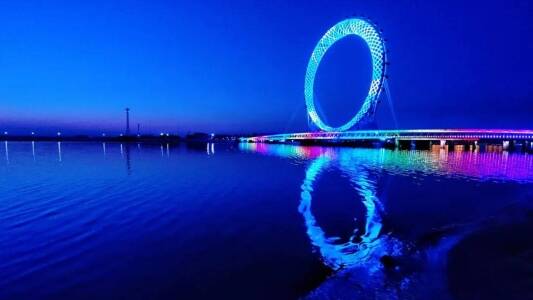 为写作此文,我又专门去看了“渤海之眼”。站在“渤海之眼”下仰望,这座145米高的世界最高无轴摩天轮以不可思议的优雅缓缓旋转,无声无息。