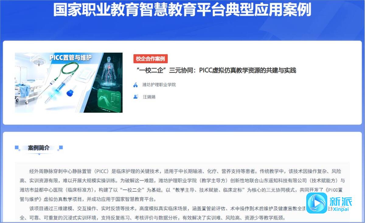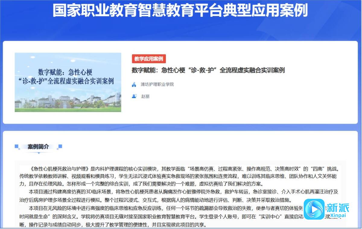 新派讯 近日,国家职业教育智慧教育平台正式公布了2025年度职业院校智慧教育平台应用典型案例收录名单,潍坊护理职业学院申报的2项案例凭借创新的实践模式、扎实的应用成效,成功入选教学应用、校企合作两大赛道优秀案例,成为少数同时斩获双赛道收录的高职院校之一,充分彰显了学校在职业教育智慧化建设领域的深厚积淀与示范引领力。