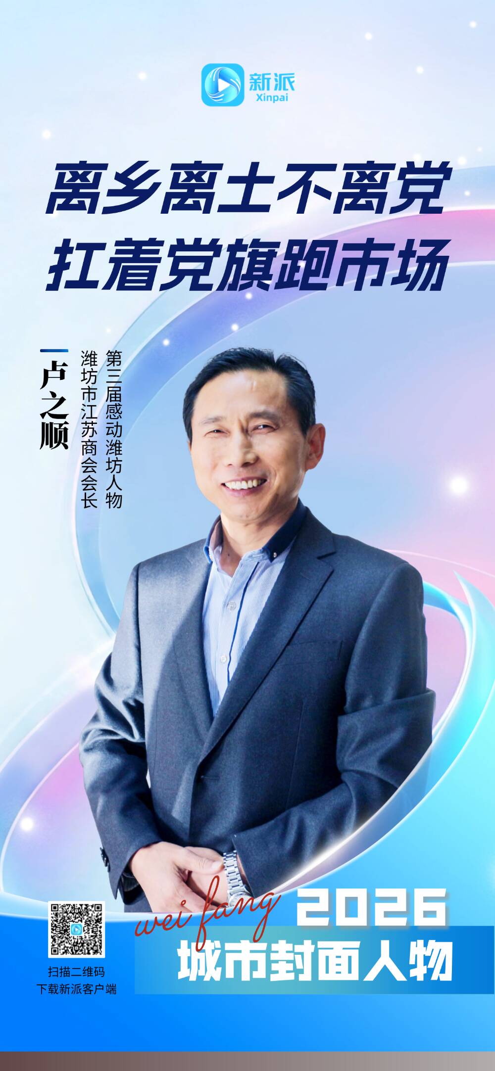 《2026城市封面人物》栏目,聚焦身边的感动,诠释潍坊城市精神,展现新时代潍坊人风采。通过开屏展示、平台热推,讲好潍坊故事,传播潍坊声音,让更多人看见 “身边的榜样”,汇聚起推动更好潍坊建设的磅礴力量。活动由中共潍坊市委宣传部、中共潍坊市委社会工作部、潍坊市文明办主办,潍坊市融媒体中心承办。本期封面人物是第三届 “感动潍坊人物”、潍坊市江苏商会会长卢之顺。