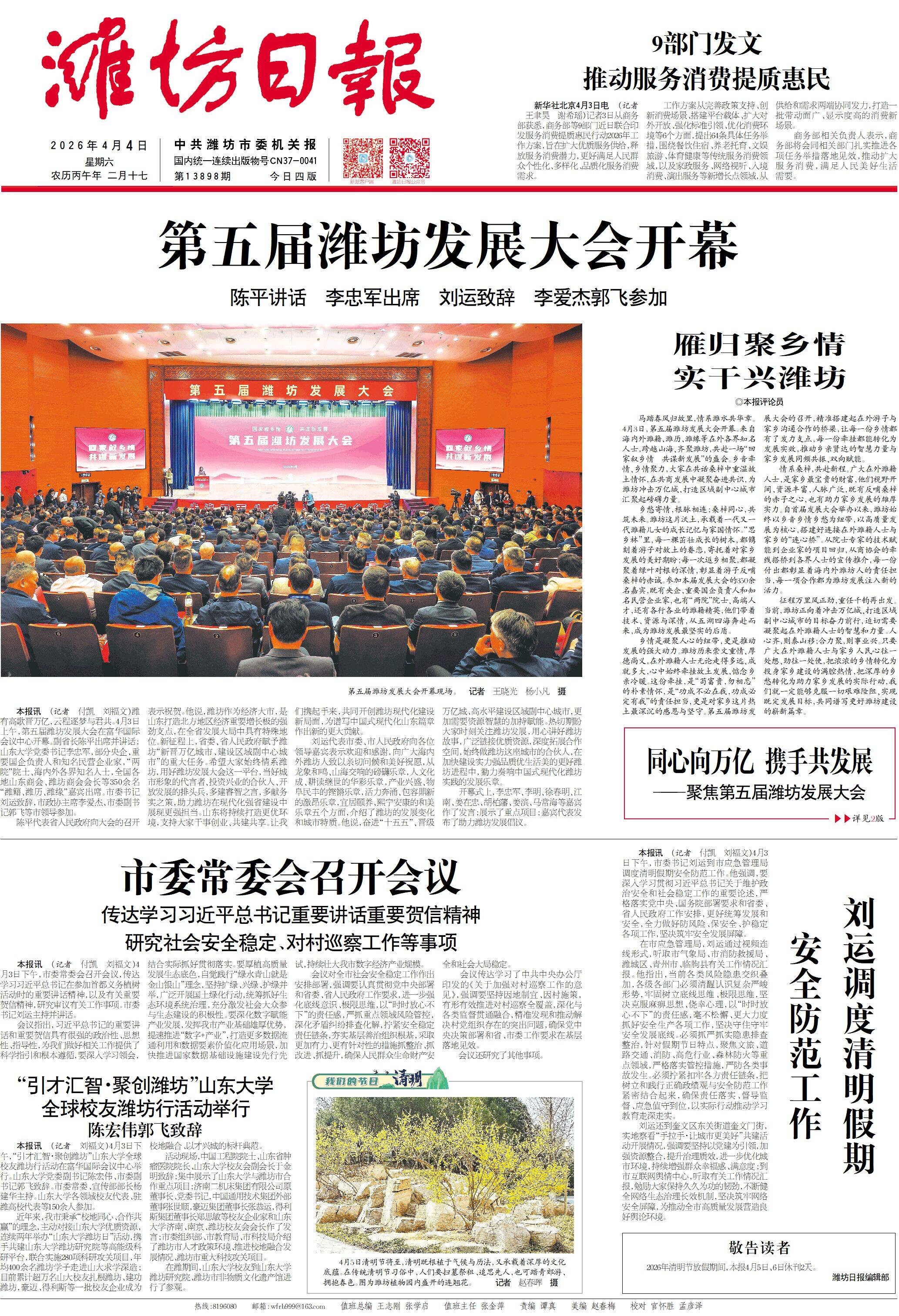 马踏春风归故里,情系潍水共华章。4月3日,第五届潍坊发展大会开幕。来自海内外潍籍、潍历、潍缘等在外各界知名人士,跨越山海、齐聚潍坊,共赴一场“回家叙乡情 共谋新发展”的盛会。乡音牵情、乡情聚力,大家在共话桑梓中重温故土情怀,在共商发展中凝聚奋进共识,为潍坊冲击万亿城、打造区域副中心城市汇聚起磅礴力量。