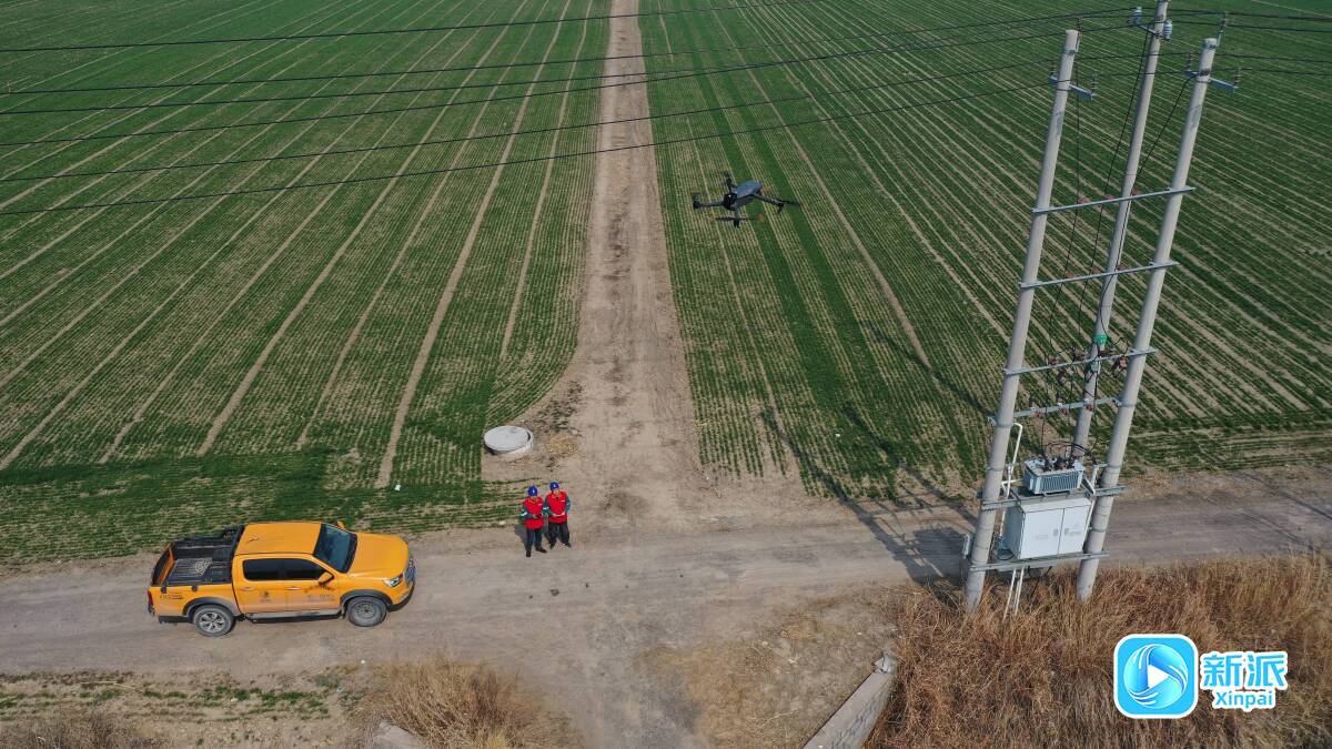 高密市供电公司使用电力定制无人机对农灌线路进行设备巡检。