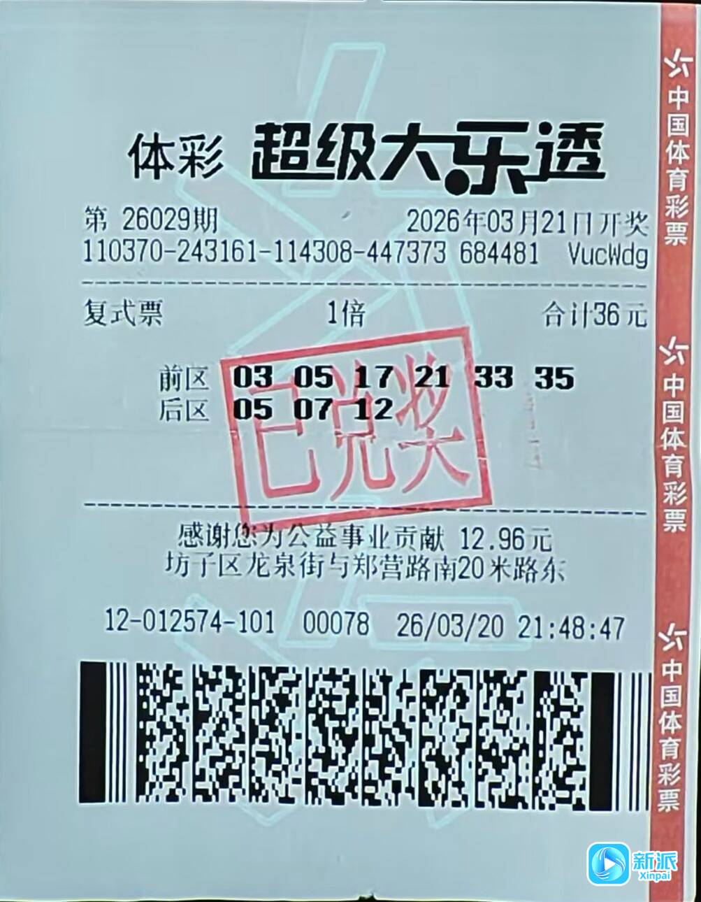 新派讯 春风送暖,好运连连!3月21日晚,体彩超级大乐透第26029期开奖,中奖号码前区“03、05、17、33、35”,后区开出号码“05、07”,本期全国共开出6注一等奖,其中1注基本投注一等奖花落潍坊市坊子区,一等奖单注奖金787万元。近日,大奖得主现身领取了这份幸运大奖。
